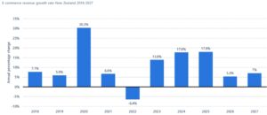 ▲ 2018~2027년 뉴질랜드 전자상거래 성장률 및 전망