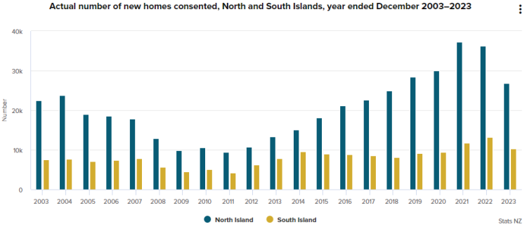 ▲ Annual new dwelling building permits in the South Island and North Island (December 2003 to December 2023) / 남섬과 북섬의 연간 신규주택 건축허가(2003.12~2023.12)
