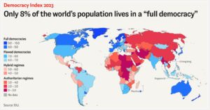 지난해 조사대상국 전체의 평균 점수는 5.23점으로, 2006년 이래 최저치를 기록했다. 완전한 민주주의 국가에 사는 인구는 세계 인구의 7.8%에 불과하며, 결함 있는 민주주의는 37.6%, 혼합형 체제는 15.2%, 권위주의 체제는 39.4%로 나타났다.