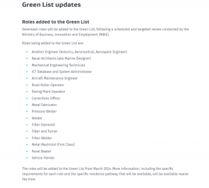 뉴질랜드 이민 장관 앤드류 리틀(Andrew Little)은 성명을 통해 항공 엔지니어, 교정관, 차량 도장공, 해군 설계사를 포함한 새로운 직업을 추가하며 더 많은 산업 분야로의 진입이 가능하다고 밝혔다. 그는 내년부터 ICT, 자동차, 엔지니어링 분야에서 뉴질랜드 근로자를 찾을 수 없을 때 전문 기술 역할을 수행해야 할 경우 그린 리스트 비자 옵션을 적용할 수 있을 것이라고 설명했다.