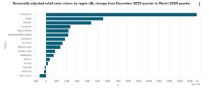 한편, 지역별로 조사한 결과, 전국의 16개 지역 중 13개 지역에서 전 분기보다 소매 활동이 증가했다. 특히 캔터베리와 오타고 지역에서는 특별한 행사에 참여한 해외 방문객의 증가와 부활절 휴가 등의 영향으로 소매 활동이 크게 늘었다. 'SailGP'와 'Warbirds Over Wanaka'와 같은 이벤트도 이러한 성장에 영향을 미쳤을 것으로 분석되고 있다.