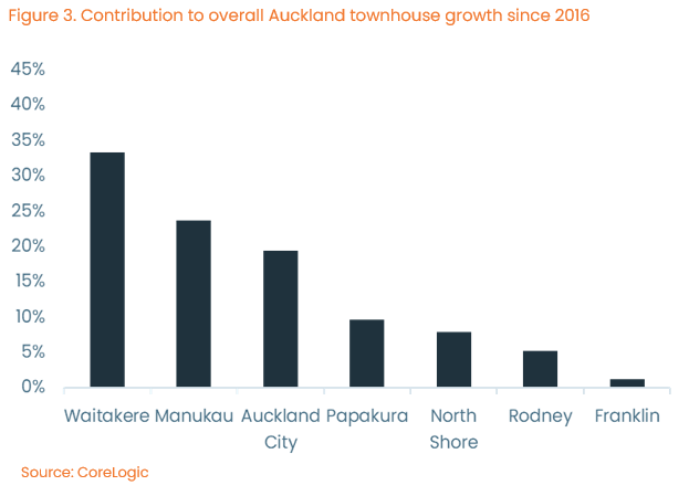타운하우스 주택 수가 가장 많이 증가한 지역은 코어로직의 데이터에 따르면 로드니, 파파쿠라, 마누카우, 웨이타케레 등으로, 이 지역들에서는 2016년 이후 타운하우스 재고가 약 50% 이상 증가했다. 하지만 로드니의 타운하우스 시장 규모가 작아, 오클랜드의 전반적인 성장 기여도는 웨이타케레(33%)와 마누카우(24%), 오클랜드 시내(19%)가 가장 크다.