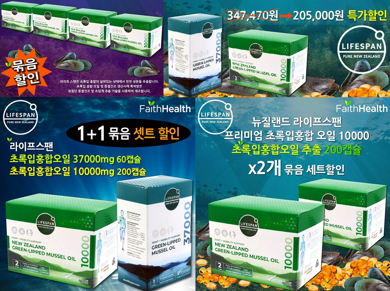 라이프스팬 초록입홍합오일 37000 60캡슐+초록잎홍합오일 10000 1묶음 2개 세트: 347,000원 정가에서 41% 할인가!! → 205,000원