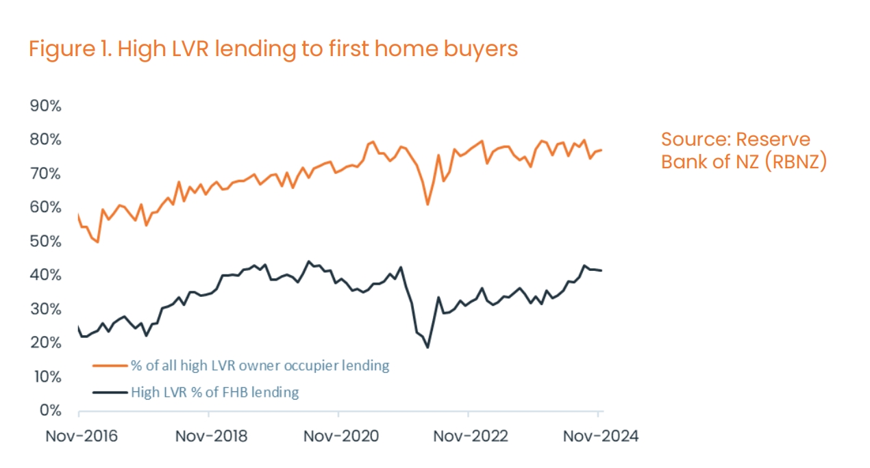 • 첫 주택 구매자가 여전히 고LVR 대출의 대부분을 차지하고 있다. 첫 주택 구매자는 고LVR 대출의 75~80%를 차지하며, 이들 중 약 40%가 20% 미만의 예치금으로 대출을 받았다. 이는 아래 그림에서 확인할 수 있다.