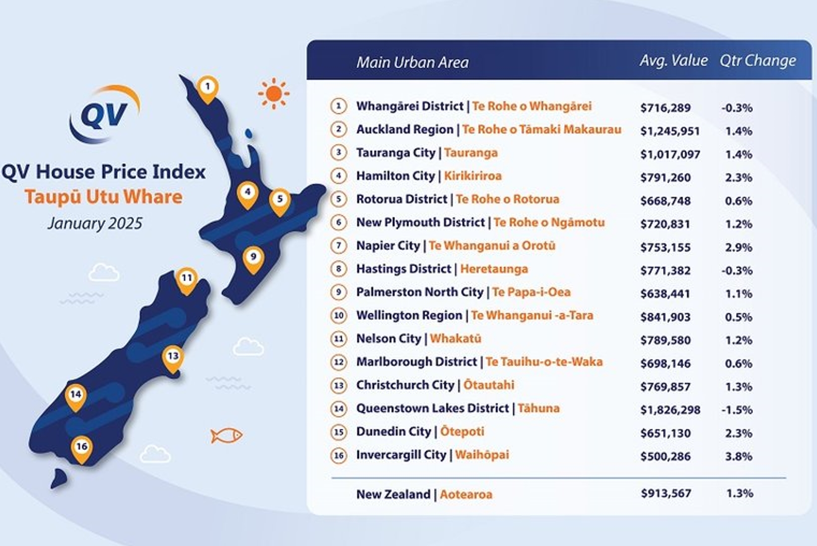 QV의 지역별 분석 결과, 2025년 1월 동안 주택 가격이 소폭 하락한 지역은 황가레이(-0.3%), 헤이스팅스(-0.3%), 퀸스타운(-1.5%) 등 세 곳에 불과했다. 반면, 오클랜드(1.4%), 해밀턴(2.3%), 타우랑가(1.4%), 네이피어(2.9%), 더니든(2.3%) 등 여러 주요 도시는 1월 3개월 동안 평균 이상의 주택 가격 상승을 기록했다. 특히, 인버카길은 3.8% 상승을 기록하며 두드러진 상승세를 보였다.