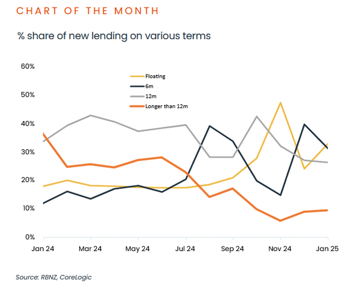 - 이번 달 차트에서는 1월에 전국적으로 새로운 차입자 중 10%만이 12개월을 초과하는 고정 금리를 선택했으며, 90%는 변동금리나 단기 고정 금리(6~12개월)를 선택한 것으로 나타났다. 향후 몇 달 동안 은행들이 주요 금리를 추가로 인하할 가능성이 있는 가운데, 이러한 차입자의 행동은 주의 깊게 살펴볼 필요가 있다.