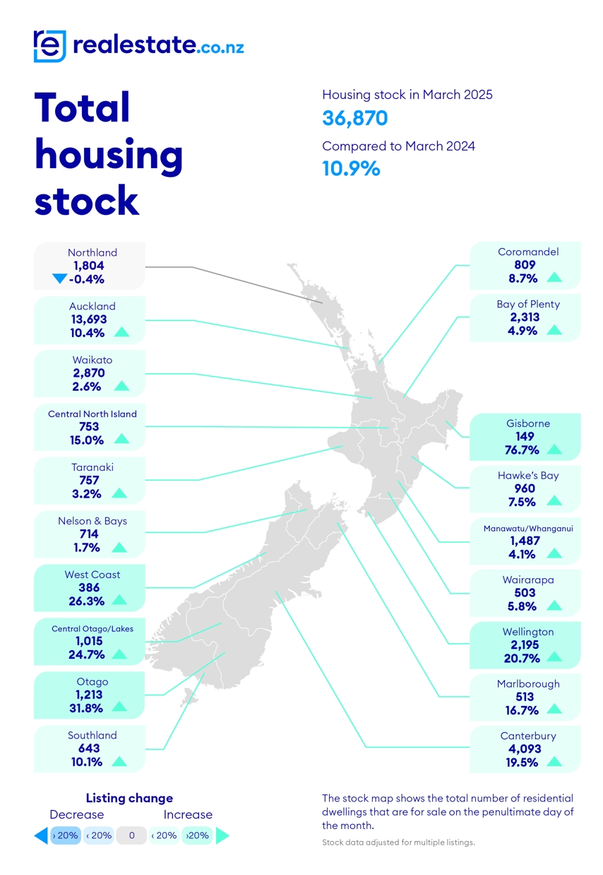 뉴질랜드 주택 시장이 겨울을 앞두고 10년 만에 가장 높은 재고 수준을 기록하며 침체 국면에 접어들고 있다. 부동산 웹사이트 Realestate.co.nz의 최신 데이터에 따르면, 지난 3월 말 기준 매물로 나온 주택 수는 작년 3월 말 대비 10.9% 증가했으며, 2023년 3월보다 25.9% 늘어난 수치를 보였다. 이는 2021년 3월 시장 호황기 이후 주택 매물 수가 거의 두 배(+90%)로 급증한 결과다.