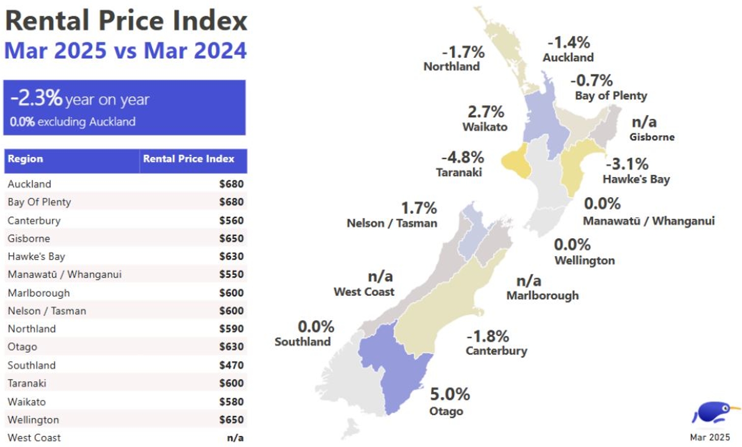 반면, 오타고(+5.0%), 와이카토(+2.7%), 넬슨/태즈먼(+1.7%) 등 세 지역은 연간 임대료 상승을 기록하며 반대 추세를 보였다. (자세한 지역별 수치는 아래 표를 참조).