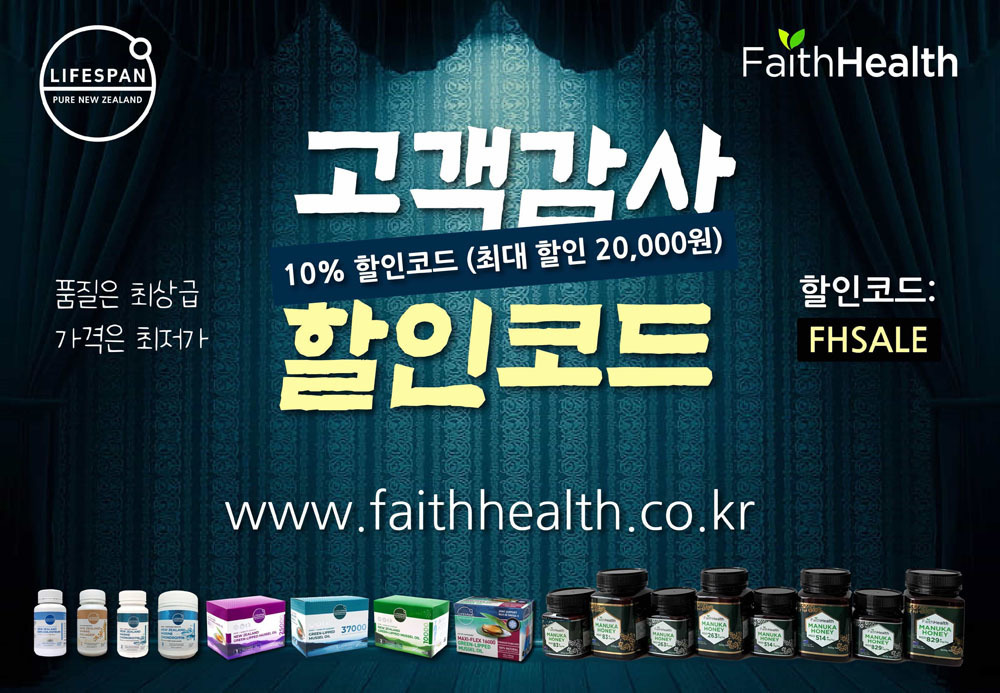 페이스헬스 스토어 https://faithhealth.co.kr 에서 회원가입 시 주어지는 할인쿠폰 증정과 더불어 구매 시에 입력하는 할인 코드( FHSALE )로 전체 구매 금액의 10% 이상 할인되는 코드를 입력하여 한국에서 가장 최저가로 구매할 기회를 드리고 있으며 모든 구매 상품은 단 한 제품이라도 모두 무료로 배송하며 소비자 관세 비용 또한 페이스헬스 측에서 모두 관세 비용까지도 무료로 부담합니다.