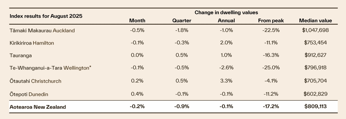 부동산 가치, 추운 겨울 맞아 A cold winter for property values Property values in Aotearoa New Zealand edged down by -0.2% in August, the fifth monthly fall in a row, according to Cotality NZ’s latest hedonic Home Value Index (HVI). National