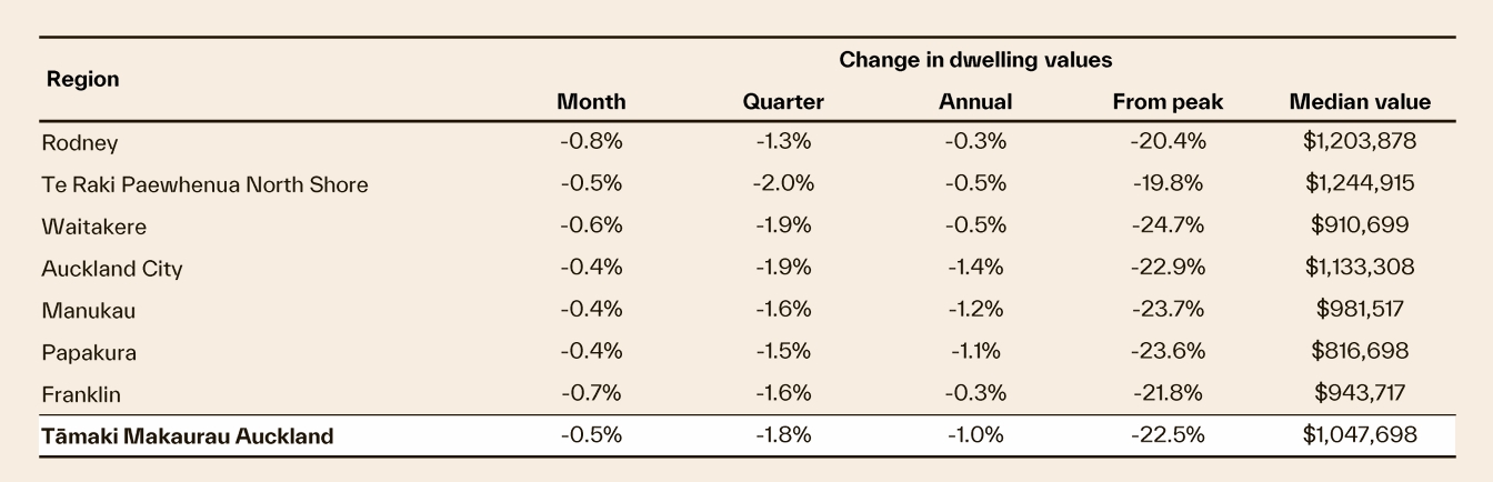 웰링턴 지역도 8월 약세를 보였다. 카피티 코스트와 어퍼 헛은 각각 -0.6% 하락했고, 포리루아는 -0.3% 하락했다. 웰링턴 시티는 보합세를 유지했지만, 지난 12개월간 -3.4% 하락했다. 지역 전체의 최고점 대비 하락폭은 카피티 코스트와 포리루아에서 약 -22%, 웰링턴 시티와 로어 헛에서는 -25% 이상으로 여전히 크다. 데이비슨은 “웰링턴의 이전 급격한 부동산 가치 하락은 진정되었지만, 그 여파가 완전히 사라지지는 않았다. 하락 속도는 느려졌지만, 웰링턴 시티는 지난 12개월간 추가 하락을 겪었으며, 고용 불확실성이 지속적인 도전 과제”라고 밝혔다.