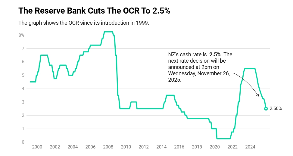 올해 상반기 예상보다 더 큰 경기 둔화가 나타나자, 뉴질랜드 중앙은행(RBNZ)은 기준금리(OCR, 공식 현금 금리)를 0.5%포인트(50베이시스 포인트) 인하해 2.5%로 내렸다. 이번 인하 폭은 지난 세 차례의 인하 폭을 모두 상회하며, 금융시장이 이 정도의 대폭 인하에 완전히 대비하지 못했던 만큼 은행의 차입 비용이 추가로 낮아질 가능성이 높다.