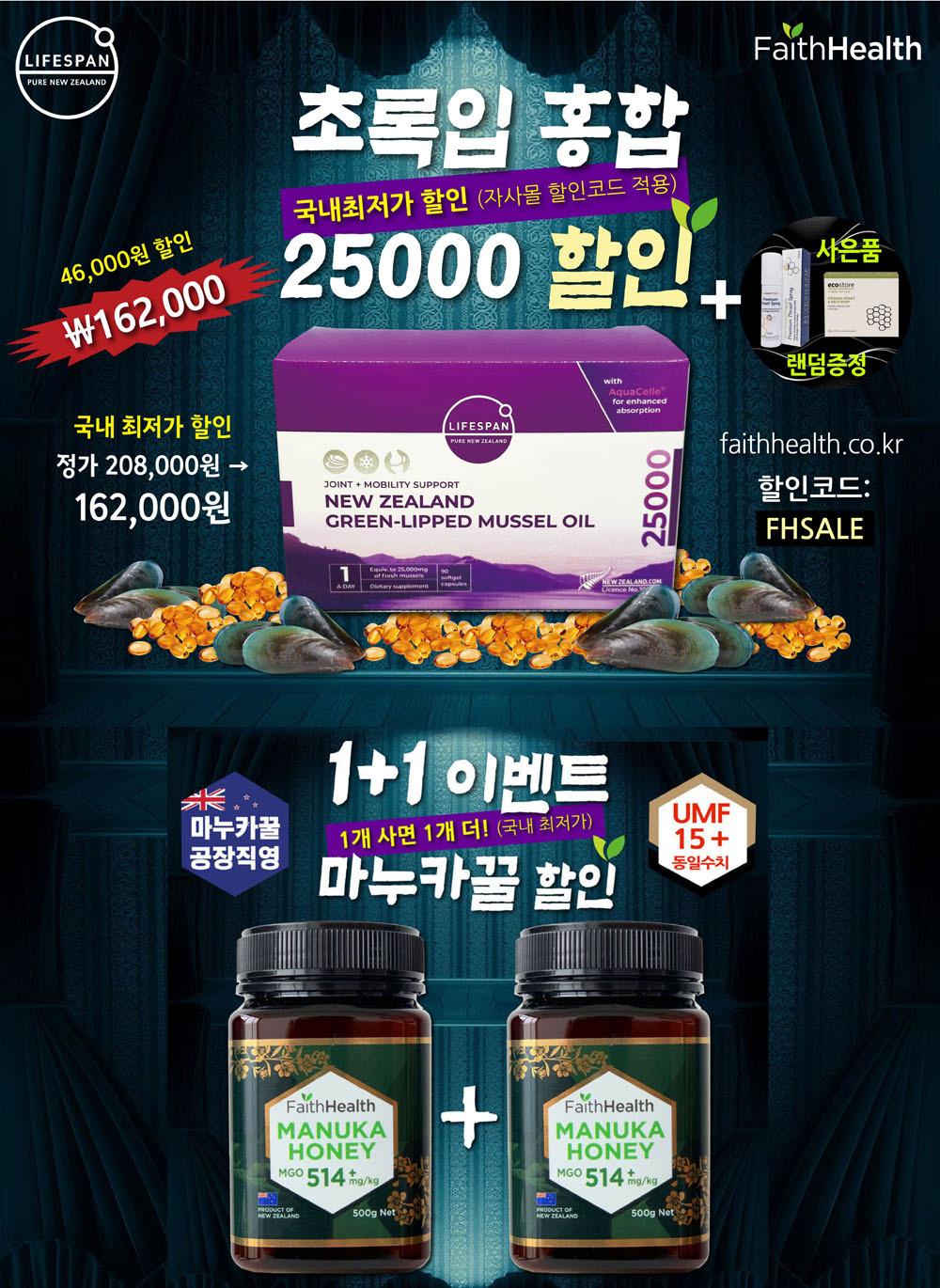 페이스헬스 스토어 ( faithhealth.co.kr ) 에서 회원가입 시 주어지는 할인쿠폰 증정과 더불어 구매 시에 입력하는 할인 코드( FHSALE )로 전체 장바구니 구매 금액의 10% 이상 할인되는 코드를 입력하여 국내에서 가장 최저가로 구매하실 수 있습니다. 또한 모든 구매 상품은 단 한 제품이라도 모두 무료로 뉴질랜드 현지에서 직배송하며 소비자 관세 비용 또한 페이스헬스 측에서 모두 관세 비용까지도 무료로 부담합니다.