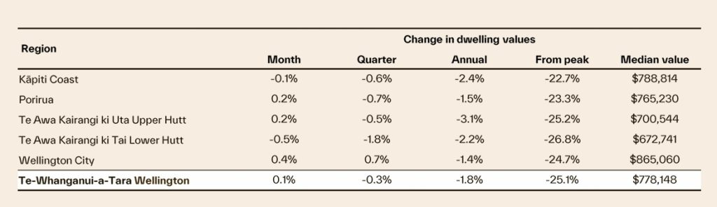 웰링턴 지역은 11월에도 혼조세를 보였다. 로어 허트(Te Awa Kairangi ki Tai Lower Hutt)는 -0.5%, 카피티 코스트(Kāpiti Coast)는 -0.1% 하락했지만, 웰링턴 시내는 0.4% 상승했다.
