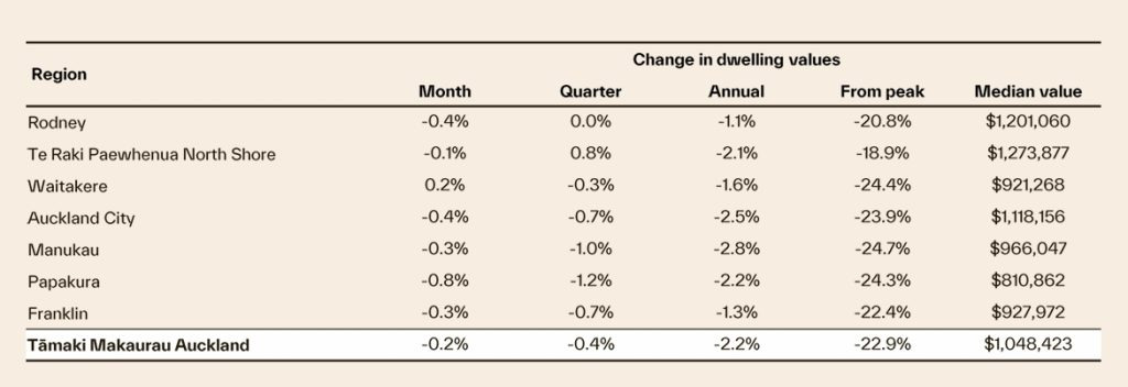 오클랜드의 여러 하위 시장은 11월에도 전반적으로 약세를 보였다. 유일하게 와이타케레(Waitakere)만 0.2% 상승했다. 다른 지역은 노스쇼어(North Shore) -0.1%에서 파파쿠라(Papakura) -0.8%까지 하락 폭이 다양했다.
