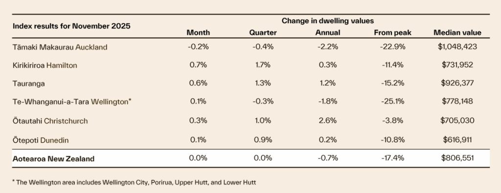 뉴질랜드 부동산 시장은 11월에도 정체를 보였다. Cotality NZ의 최신 주택가치지수(Home Value Index, HVI)에 따르면 10월 0.1% 소폭 상승 이후 11월에는 거의 변화가 없었다.