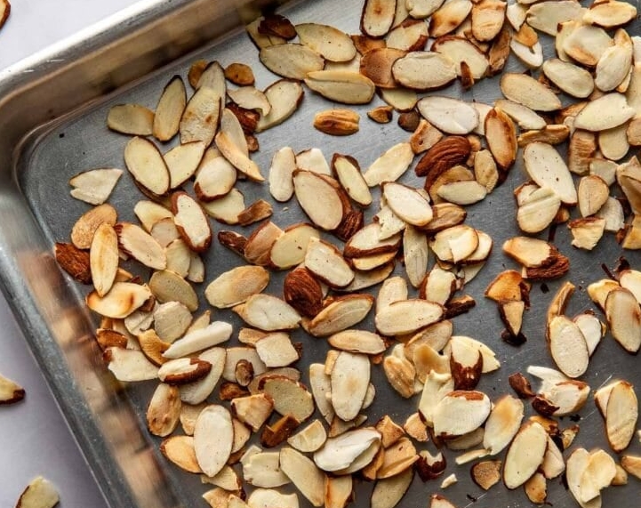 두꺼운 프라이팬이나 냄비를 예열한다. 껍질을 깐 하얀 아몬드를 넣는다. 고소한 향이 나고 노릇노릇한 밤색이 될 때까지 5분간 불에서 저어준다. 오일이나 버터를 조금 두르면 타지 않고 고르게 구울 수 있다.전자레인지 사용시: