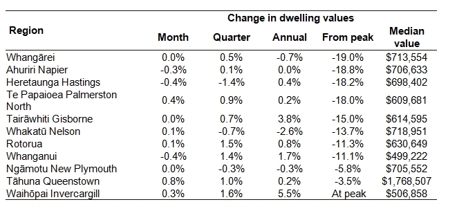 주요 도시 외 지역에서는 혹스베이가 다소 뒤처진 모습을 보이고 있다. 헤이스팅스와 네이피어는 1월 주택 가치가 하락했으며, 왕가누이 역시 약세를 나타냈다. 반면 인버카길은 다시 0.3% 상승했고, 파머스턴 노스와 퀸스타운도 상승세를 보였다.